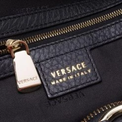 This fashionable tote by Versace is the all black handbag that every woman needs for daily wear. Crafted from black grained leather, it is detailed with a Versace logo, buckle handles, a double zipper closure and gold tone hardware. The hold all interior has a zip pocket and two patch pockets.