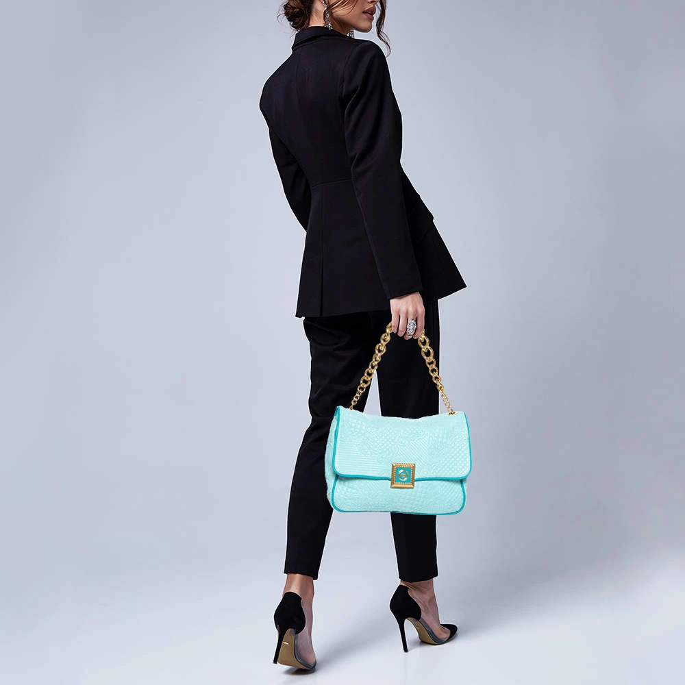 How gorgeous is this bag from Versace! Crafted from turquoise leather and gold-tone hardware, it carries an outstanding design. It has a fabric interior secured by a front flap and a shoulder strap. The tasselled-Medusa detail uplifts its beauty and makes it a buy you will not regret.