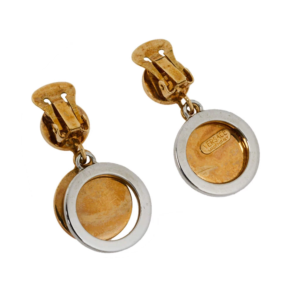 Perfect to create an instantly glamorous and sleek look, these Versace drop earrings are sure to stand out with your special looks. Constructed in gold-tone metal, these earrings have signature Medusa-shaped drops accompanied by a silver-tone ring. The pair definitely stands out.
