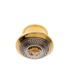 Exquisitely crafted from two-tone metal, this ring from Versace is a feast to the eyes. It exhibits the iconic and instantly recognizable Medusa logo in the center, outlined by Greek Keys, and a smooth layered end. Brimming with artistic excellence, this stunner of a ring deserves to be worn by you!