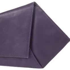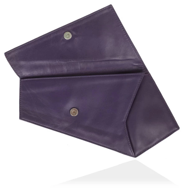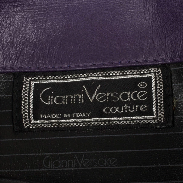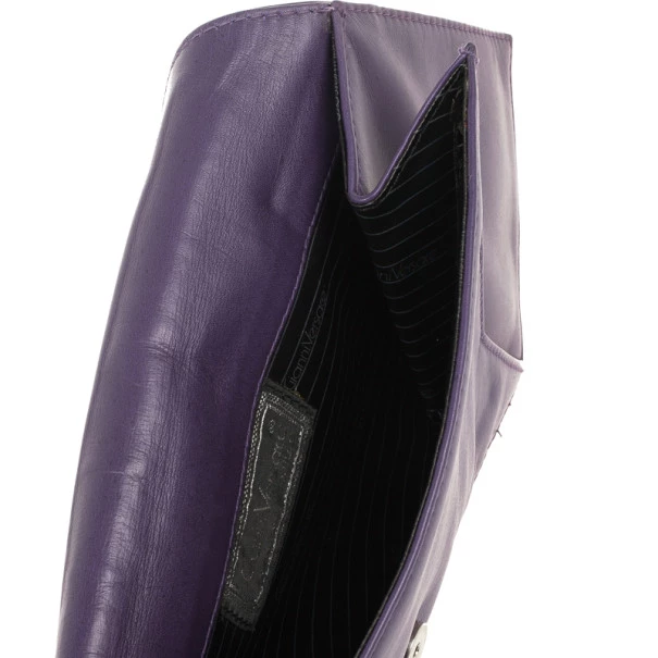 This unique light weight clutch from Versace is crafted from soft purple leather. With its geometric design, it is sure to turn all eyes on you. Equipped with a flap snap closure, this clutch is lined with fabric.