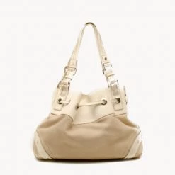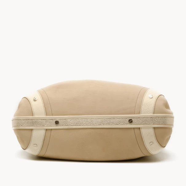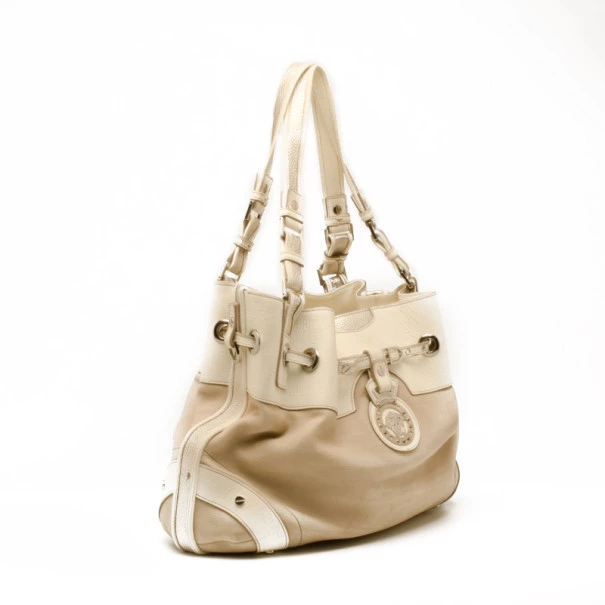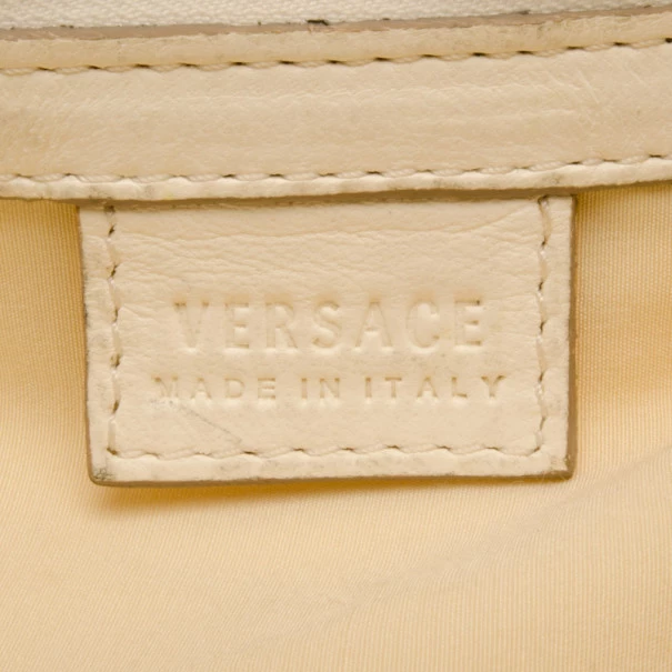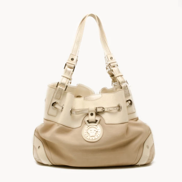 This easy to wear chic Versace leather tote is ideal for any casual occasion. Made from beige leather with contrasting white leather trim, this relaxed shaped tote features a Versace pendant, drawstring closure and polished silver hardware. It’s spacious interior is lined with fine textile and features a patch pocket.