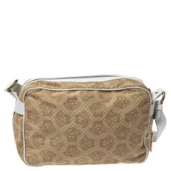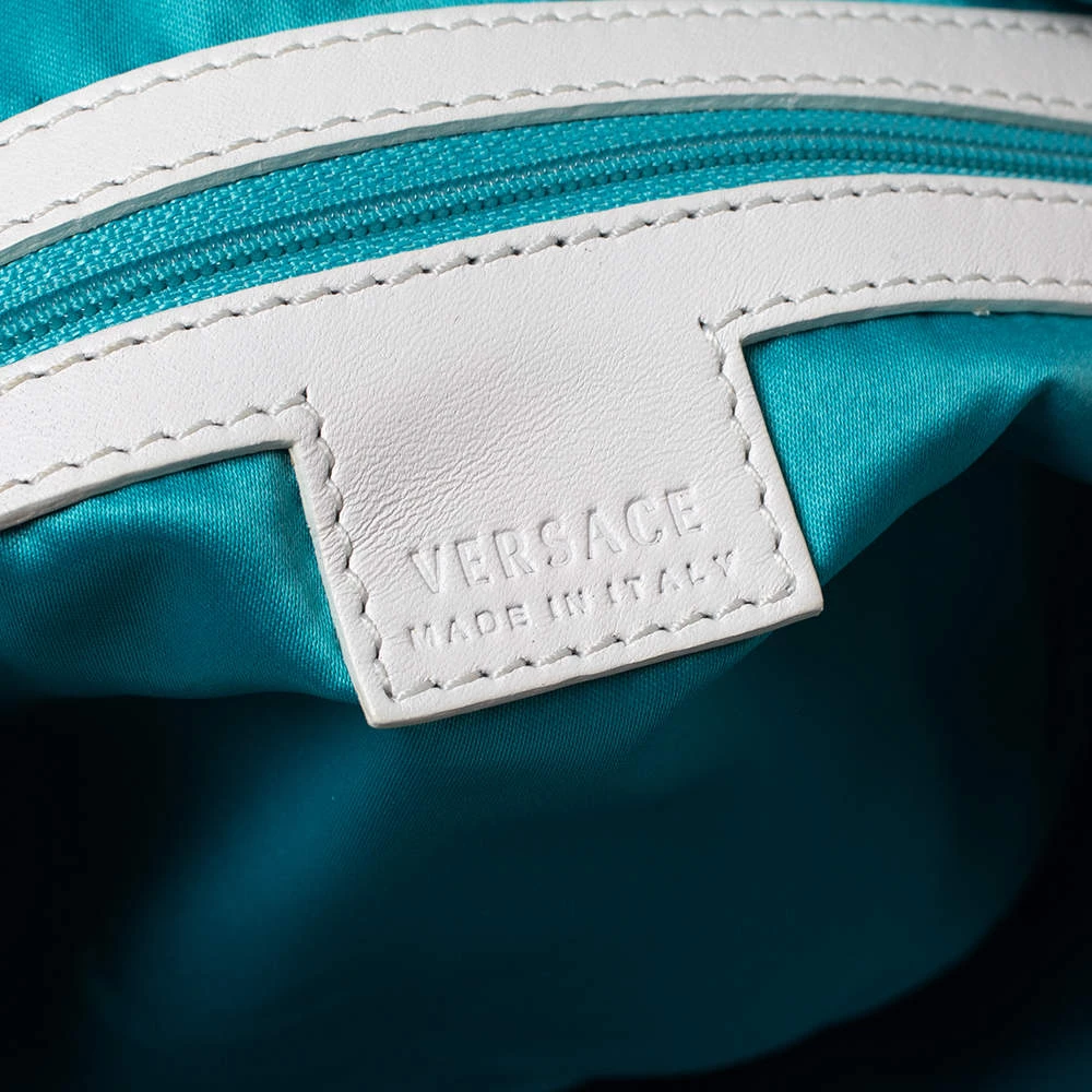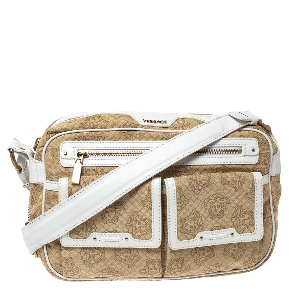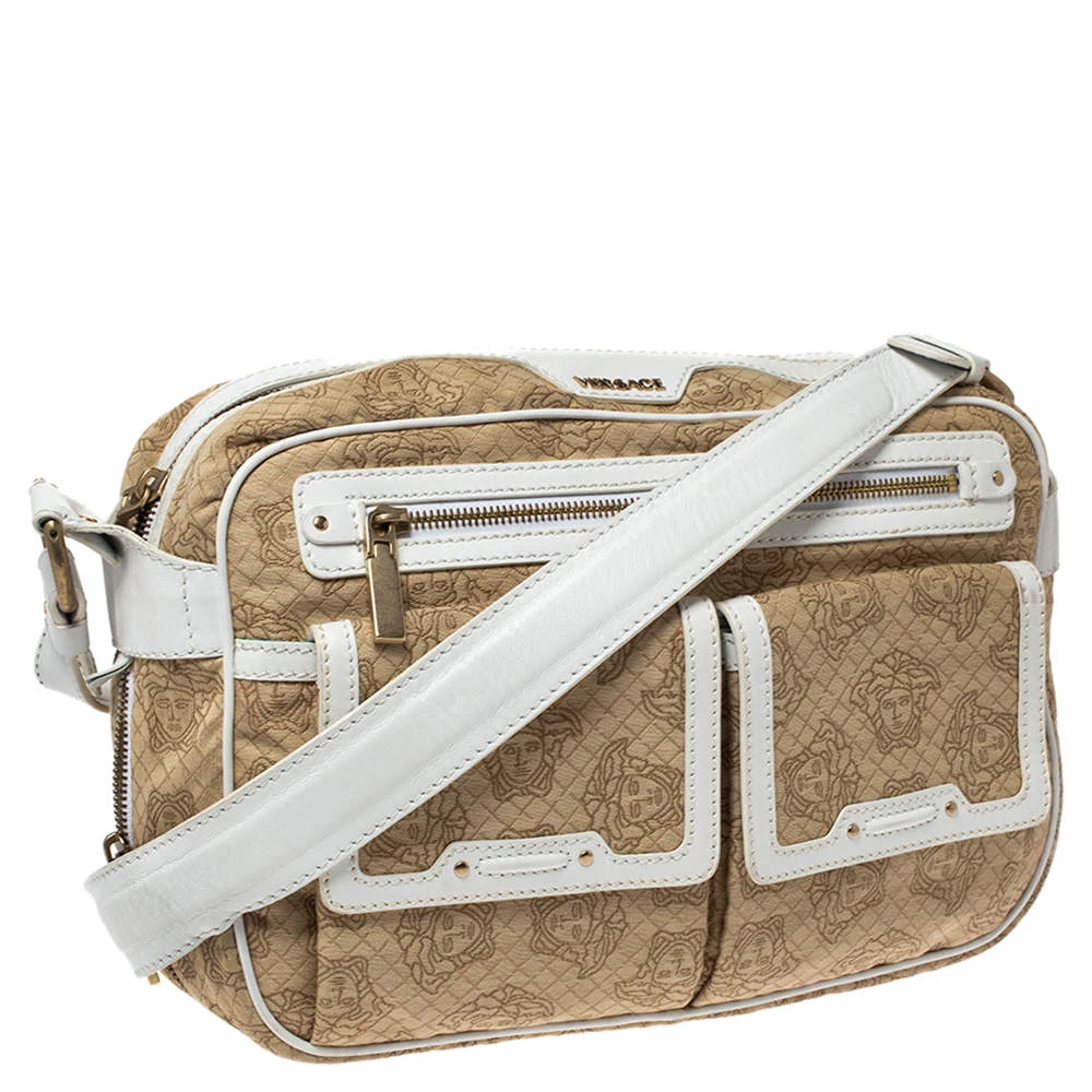 This stylish and functional shoulder bag by Versace is perfect for busy days. Crafted from Medusa print fabric and leather, it comes in lovely hues of white & beige. It is styled with a shoulder strap, two exterior pockets, zip closure and a spacious satin-lined interior. It is finished with gold-tone hardware.
