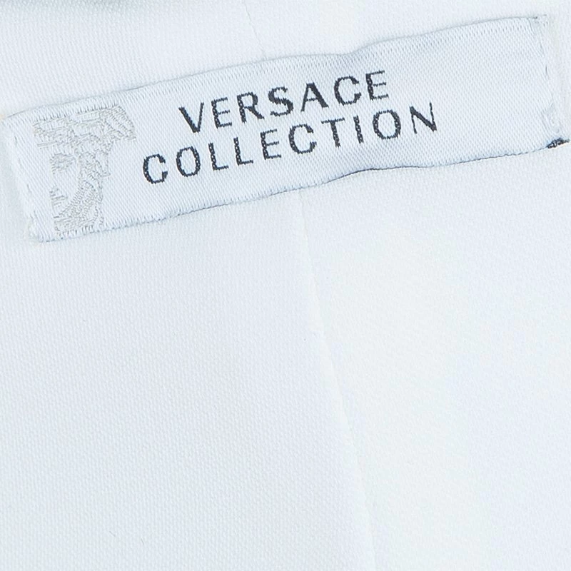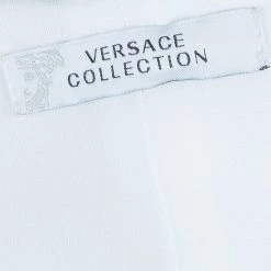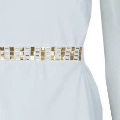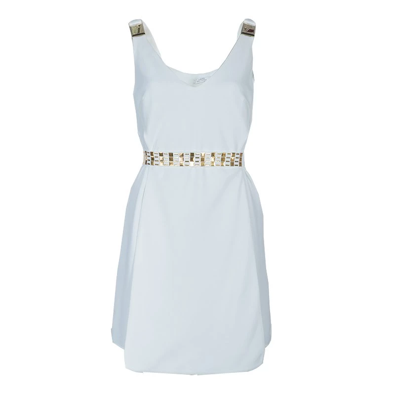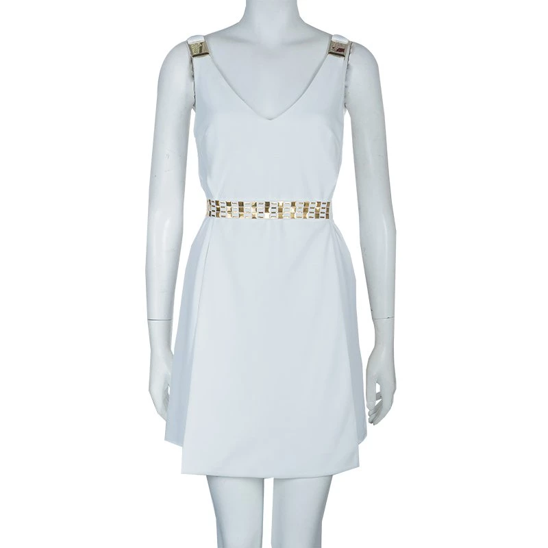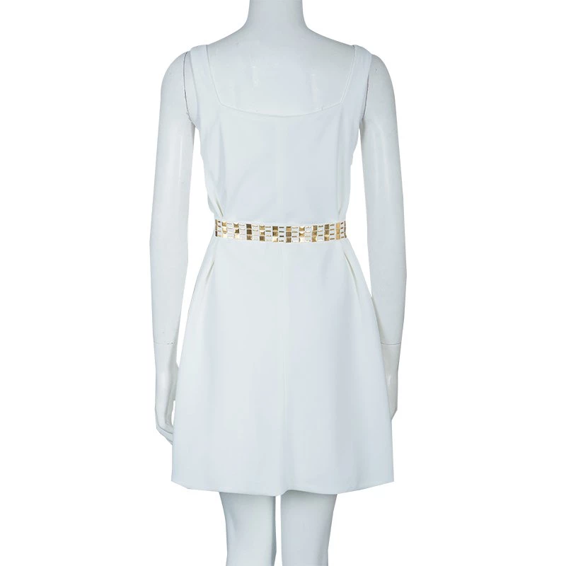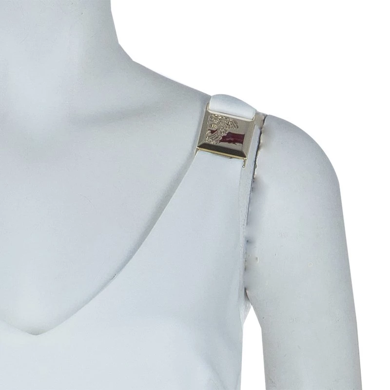This Versace dress draws glamour with its sophisticated and elegant design. Cut from a viscose-polyester blend in white color, the sleeveless dress is accented with a gold-tone buckle detailing at the shoulder straps and at the waist belt. It features a V-neckline on the front and a square neckline on the back and a flared skirt-bottom.