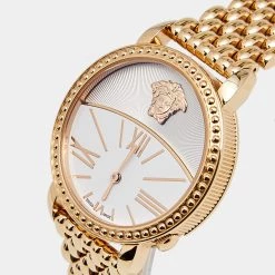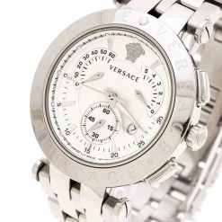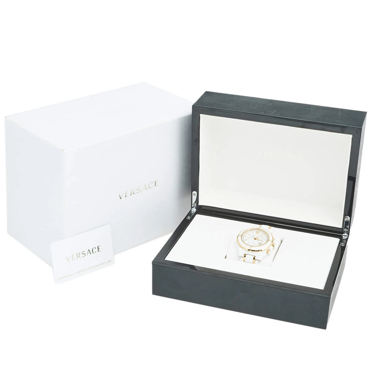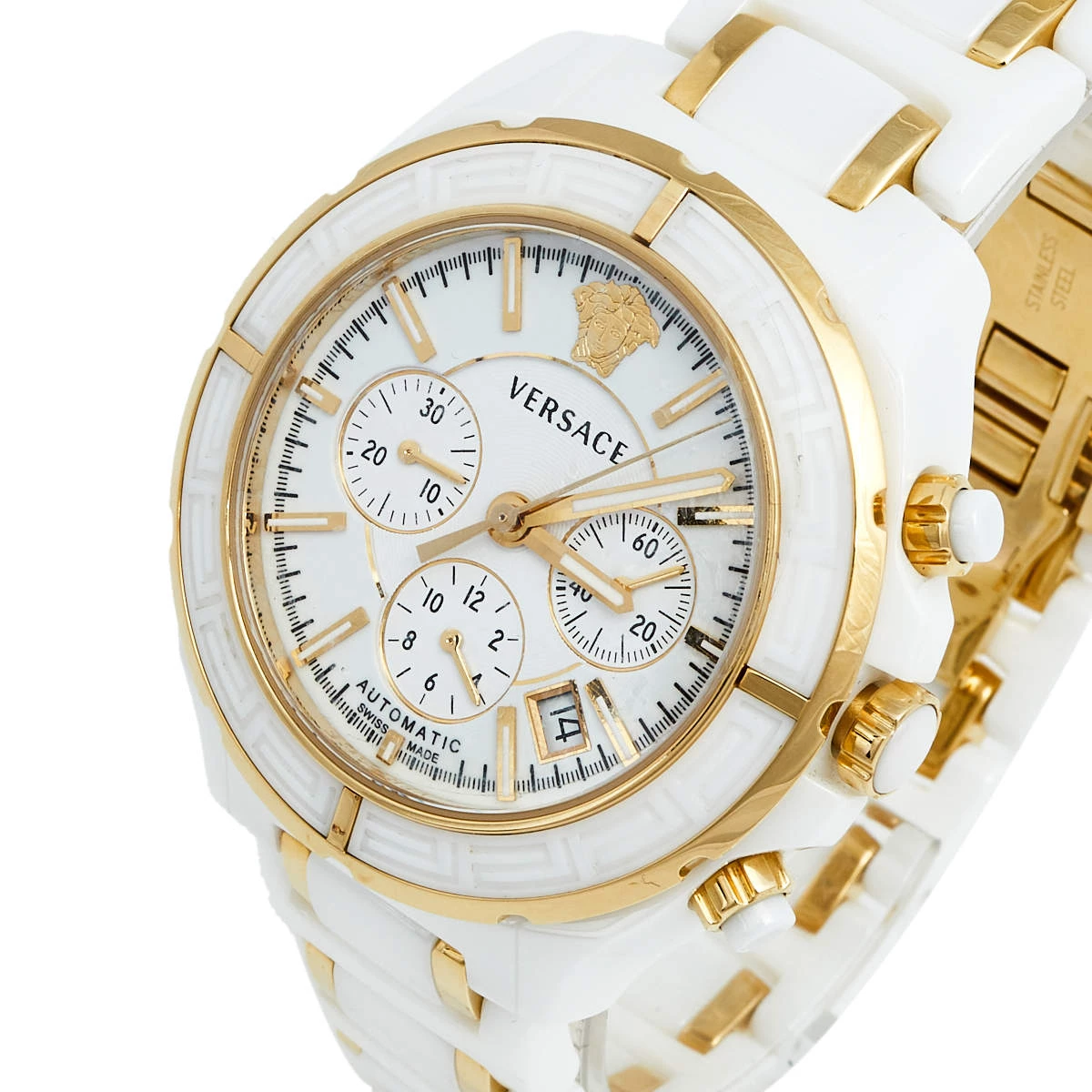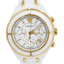 A fine piece of accessory to pair with both your daytime casuals as well as smarter looks, this Versace wristwatch is a must-have for all with classic taste. An exemplar of the label’s fine artistry, this watch features a beautiful white dial set with elegant hour markers, three hands, three subdials, and a date window.