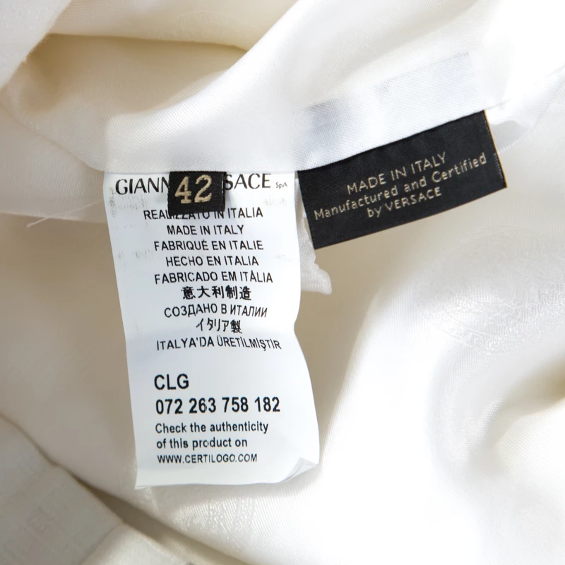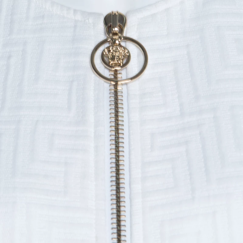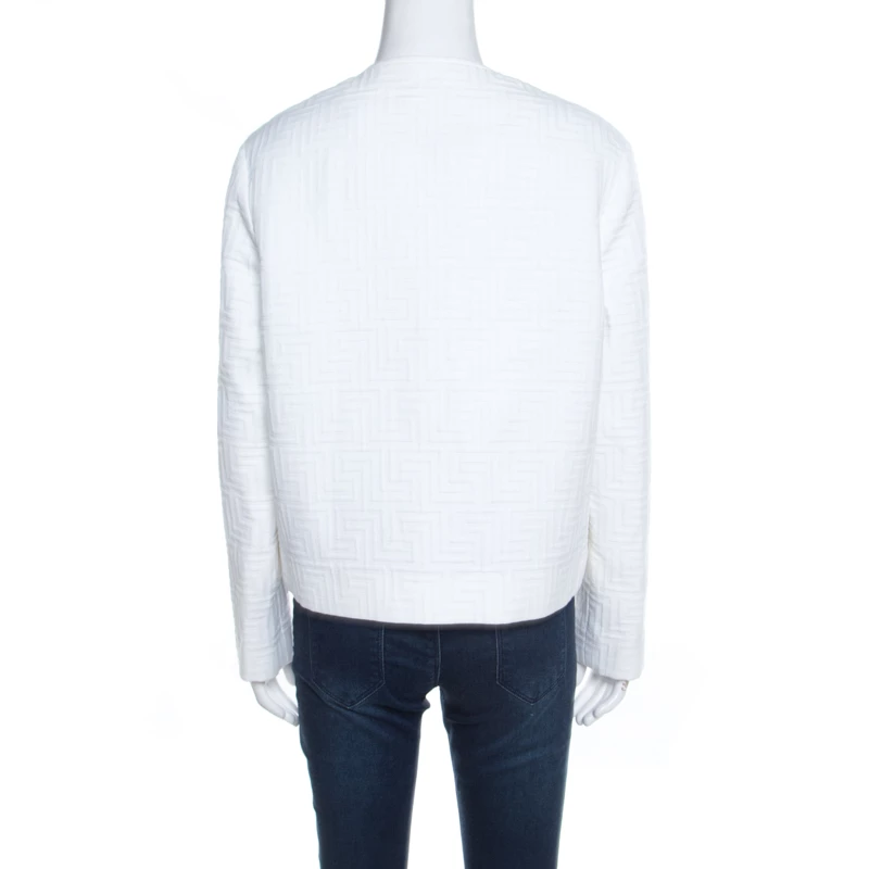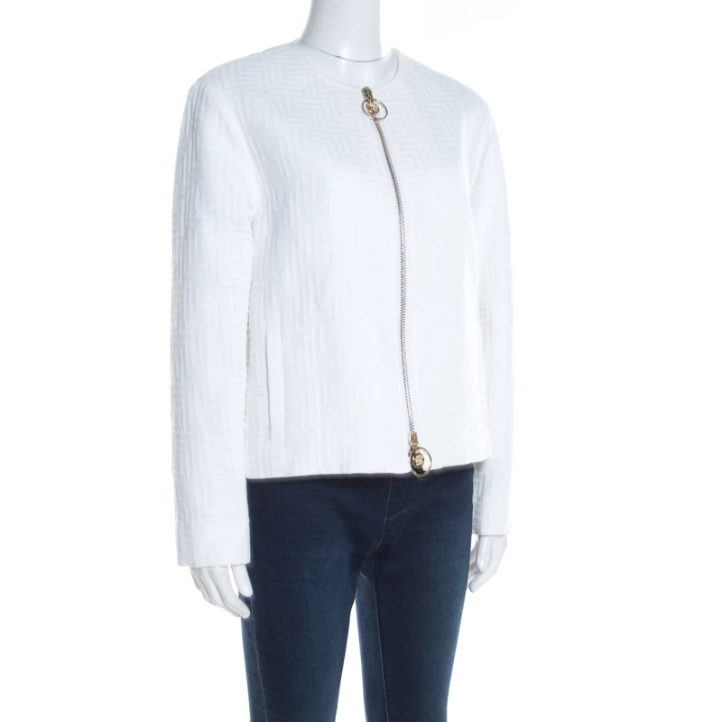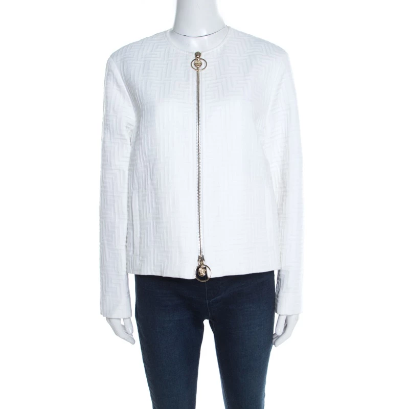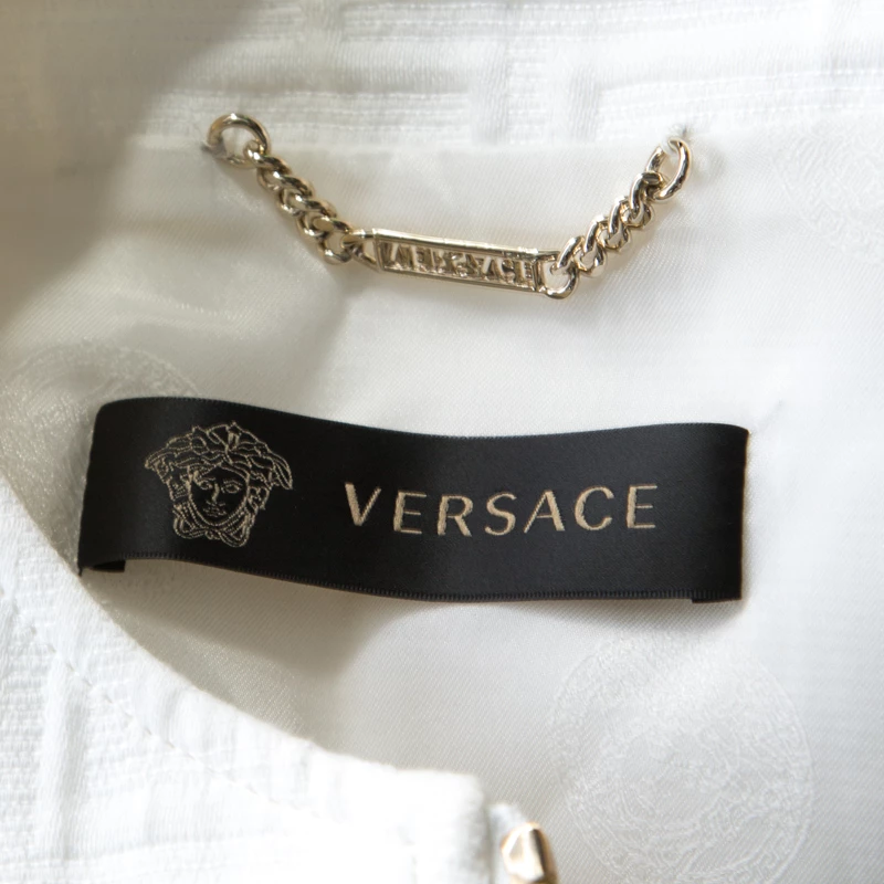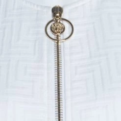 A classic jacket carrying a white hue is a piece that every modern-day fashionista must have. Coming from the house of Versace, this jacket is every bit elegant and classy. The signature embossing the expanse and frontal zip fastening make this formal jacket both tasteful and comfortable. Style this with statement-making outfits for a different look.