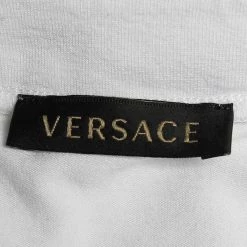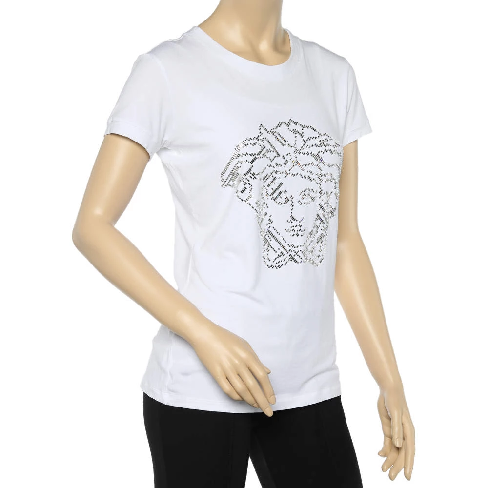 This stylishly simple T-shirt from Versace is all you need to complete your casual-chic attire. Made from knit fabric, it flaunts a lovely crystal-embellished Medussa head on the front and is short-sleeved. Pair the white tee with black jeans and a crossbody bag.