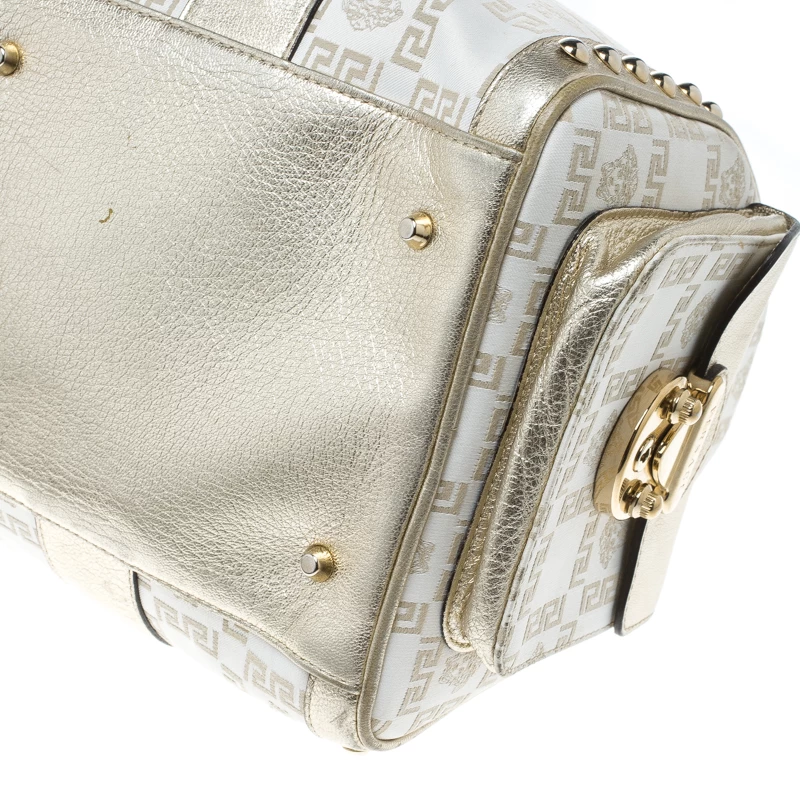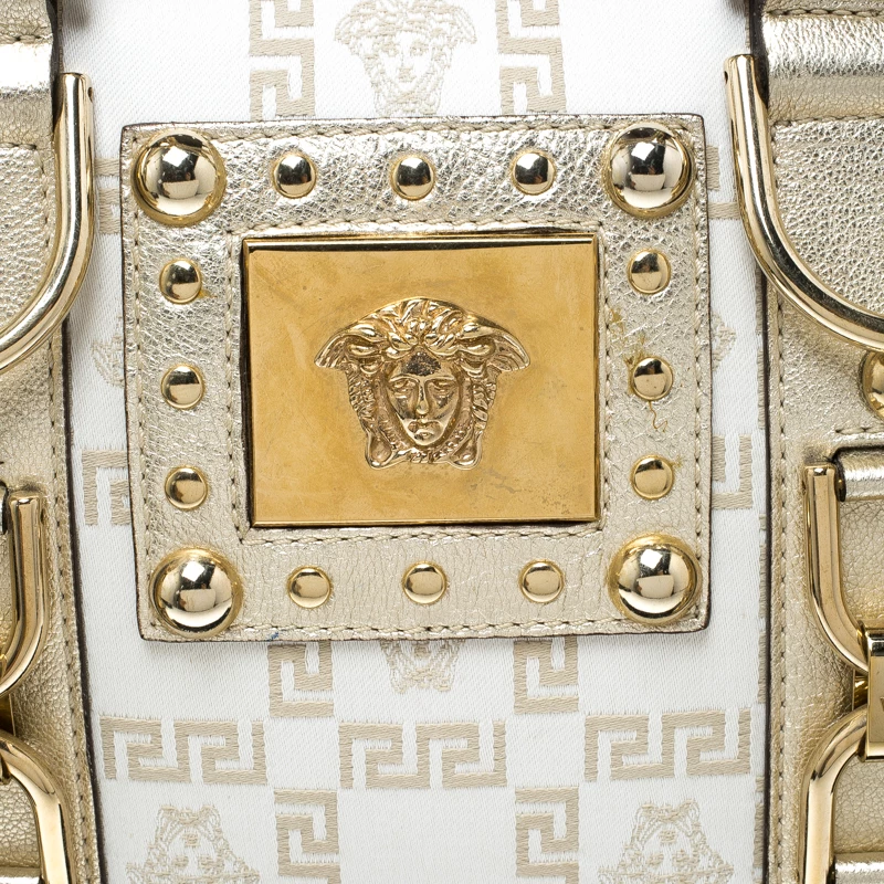 This Versace Snap Out Of It satchel is a bold statement-making bag from the fashion-forward Italian label. Crafted from white fabric and gold patent leather, it is accented with rolled double handles, a side pocket, and gold-tone hardware. The interior is lined with satin and features a zip pocket. It will bring just the right amount of glamour to understated evening ensembles | This fashionable bag will make an elegant addition to your collection and is perfect for all kinds of outfits and occasions!.