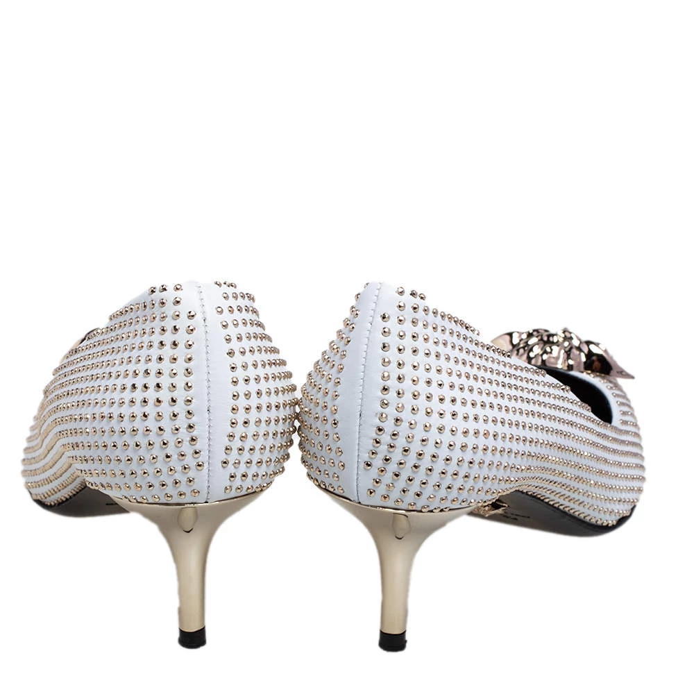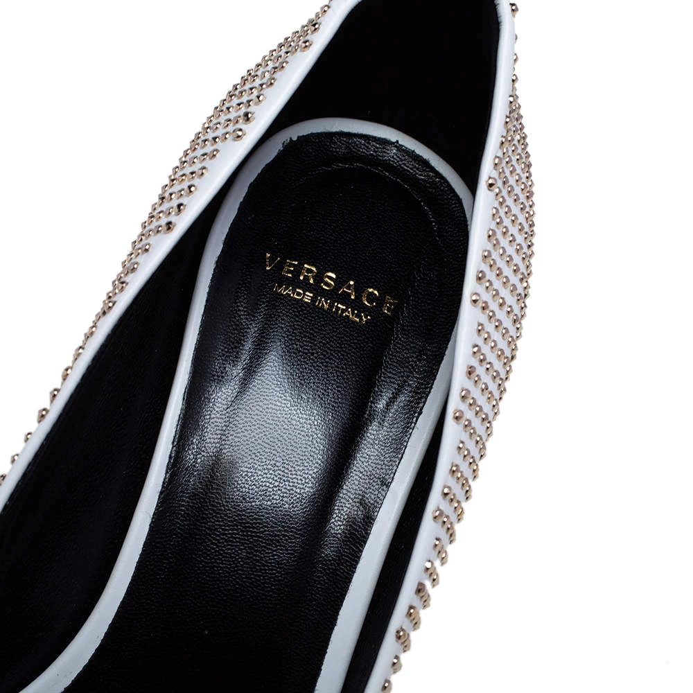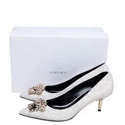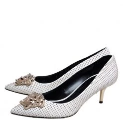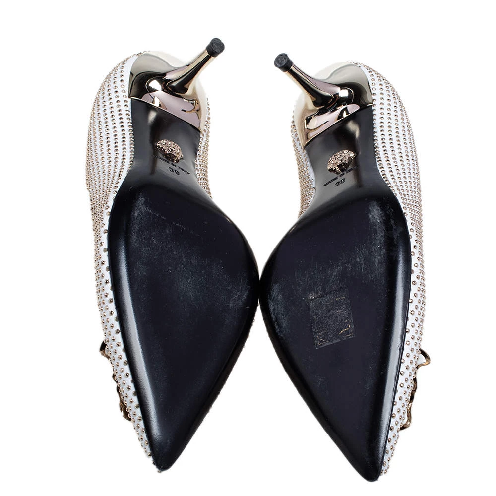 Treat your feet to the best footwear by choosing these fine pumps from Versace! The white pumps have been crafted in Italy using leather and are covered in gold-tone metal studs. They are designed with the Medusa motif on the pointed toes and 7 cm heels.