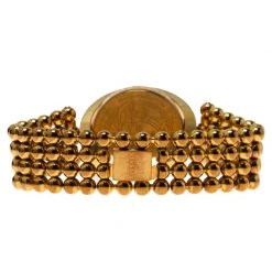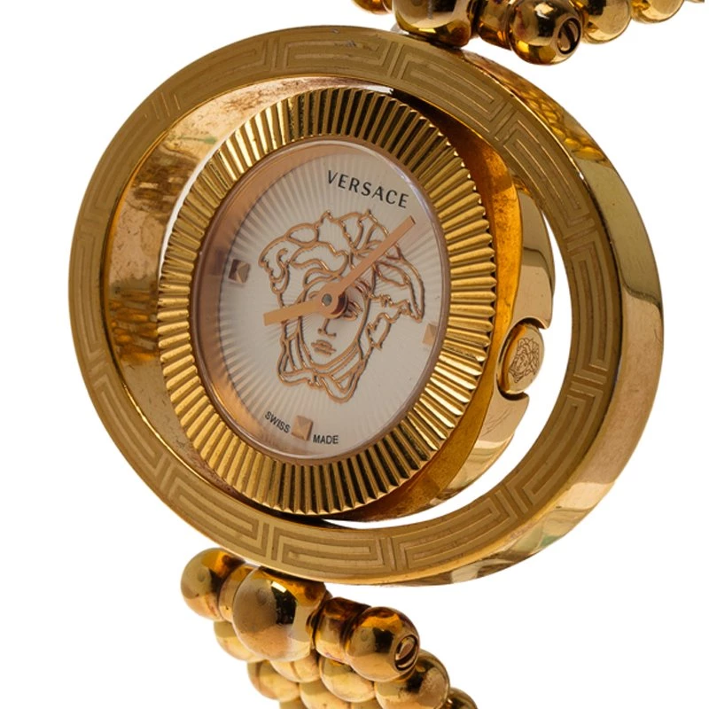 An exclusively subtle and ultra-feminine timepiece from Versace will make an urban style statement! The ultimate structure with an outer ring makes a catchy way to the actual rotating bezel. Made from gold-plated stainless steel, this watch comes with a fine white dial that houses luminescent hands and hour indicators along with the striking brand logo on the background. The impressive bracelet comes in beaded accent featuring a clasp closure and the 30M water resistant has a quartz movement. Match it with a contrasting gown to grab a ladylike stance!