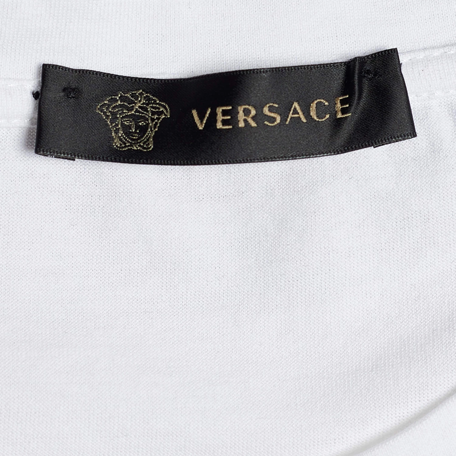 This T-shirt from the House of Versace is all about sporting a classy and comfy style. It is tailored from white jersey fabric, with a sequined Medusa logo adorning the front. It features short sleeves and a rounded neckline. This T-shirt is great for casual use.