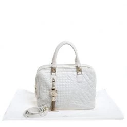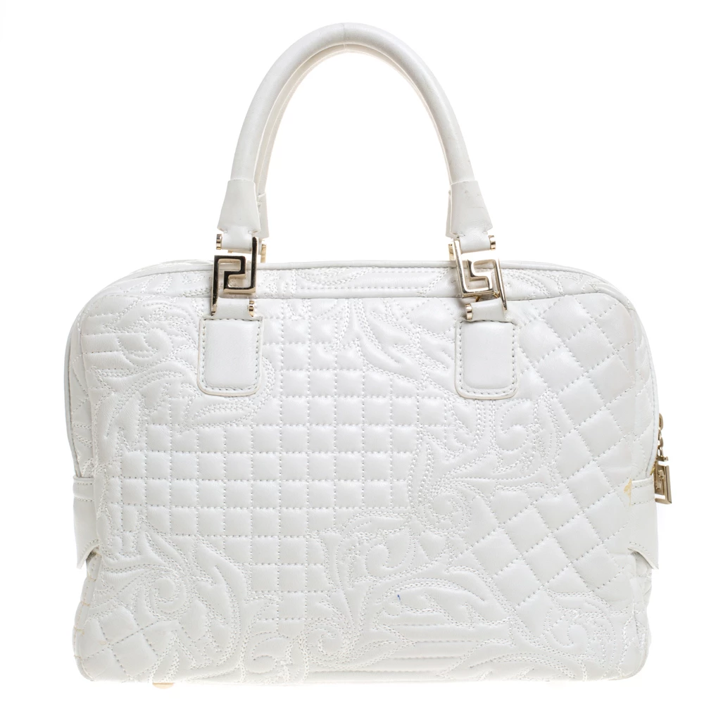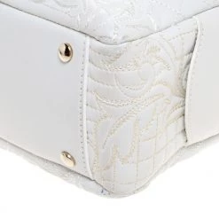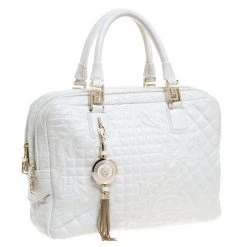 How gorgeous is this bag from Versace! Crafted from white leather and gold-tone hardware, it carries an outstanding design. It has a fabric interior secured by zippers and it is held by two handles. The tasselled-Medusa charm uplifts its beauty and makes it a buy you will not regret.