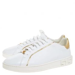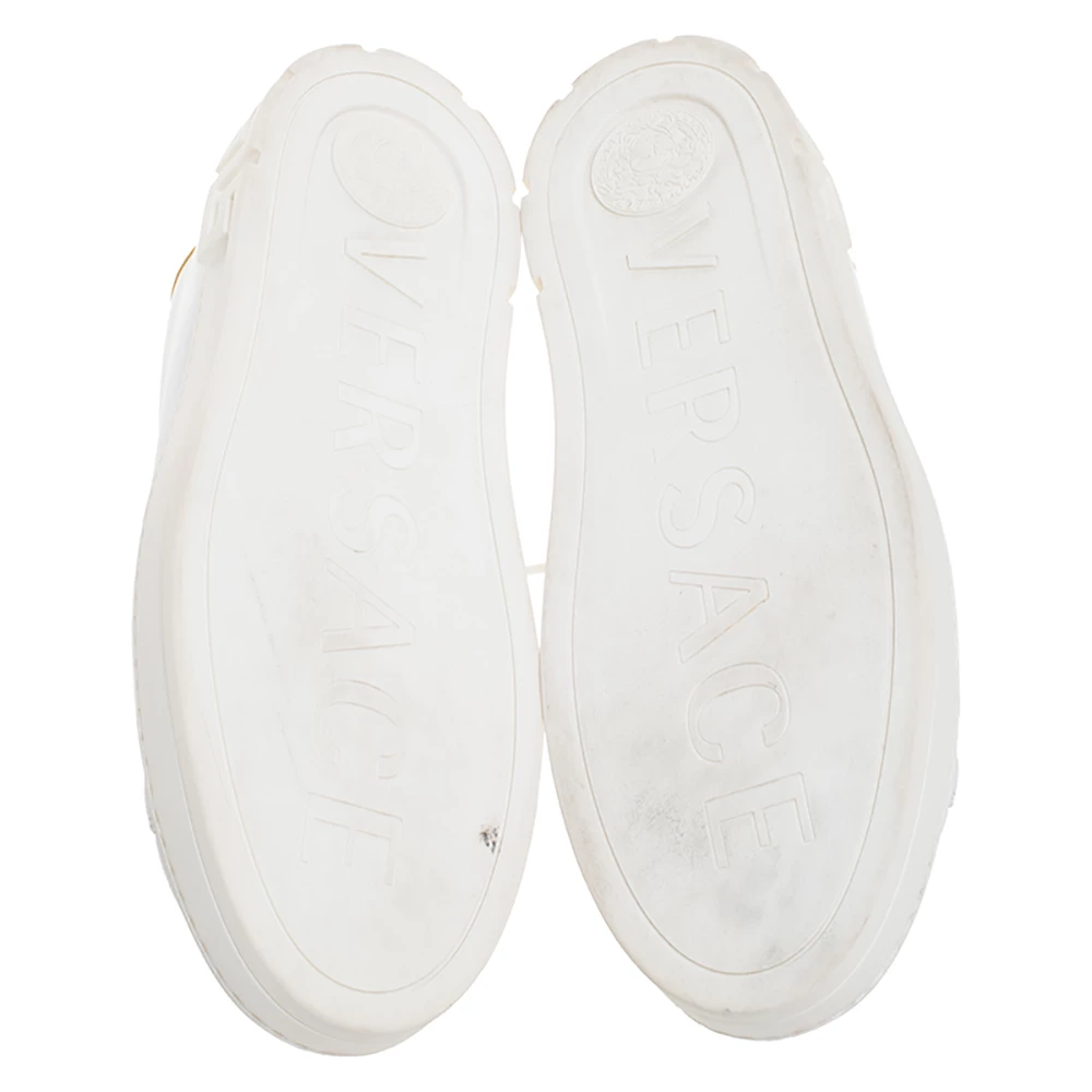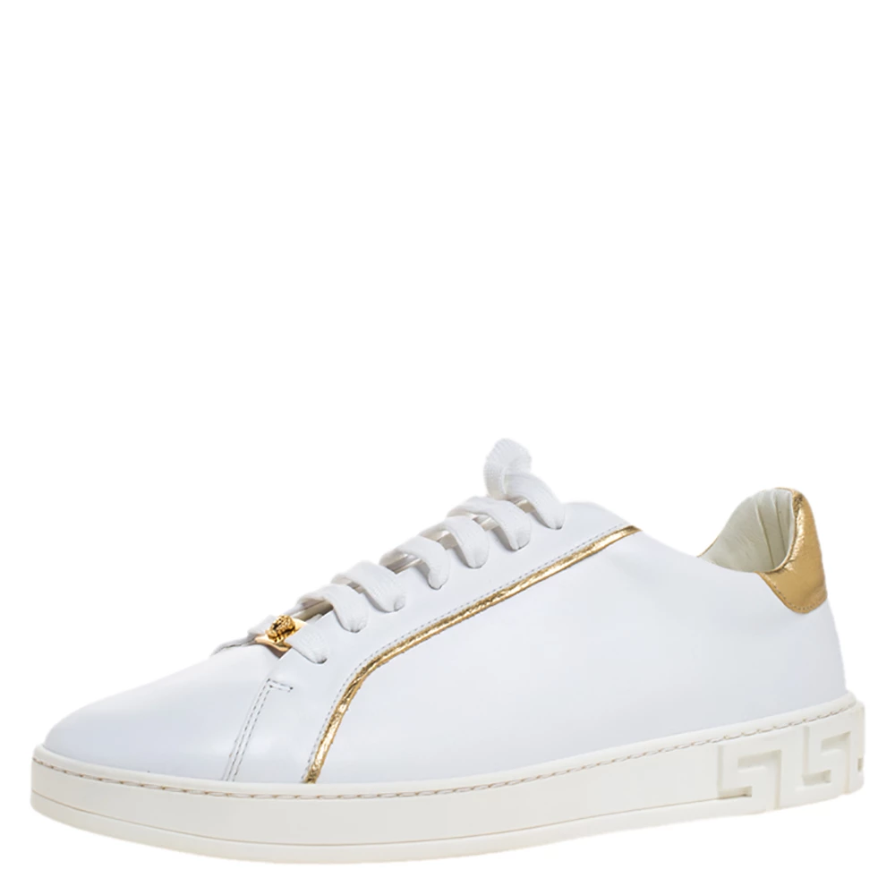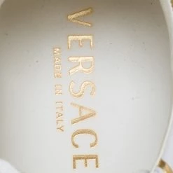 These sneakers from Versace are effortlessly suave and amazingly stylish. Brimming with fabulous details, these white sneakers are crafted from leather into a low-top silhouette and feature a lace-up detailing at the front and gold-tone Medusa logo. They flaunt leather-lined insoles and comfortable rubber soles.