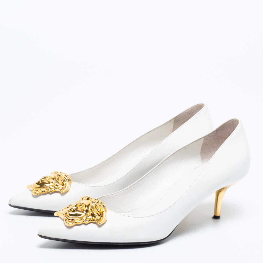 Versace’s timeless aesthetic and stellar craftsmanship in shoemaking is evident in these stunning pumps. Crafted from leather in a white shade, they are topped with the signature Medusa accent and mounted on sturdy heels for the right amount of elevation.