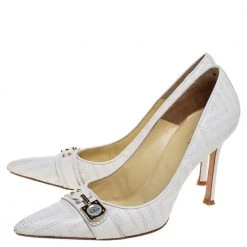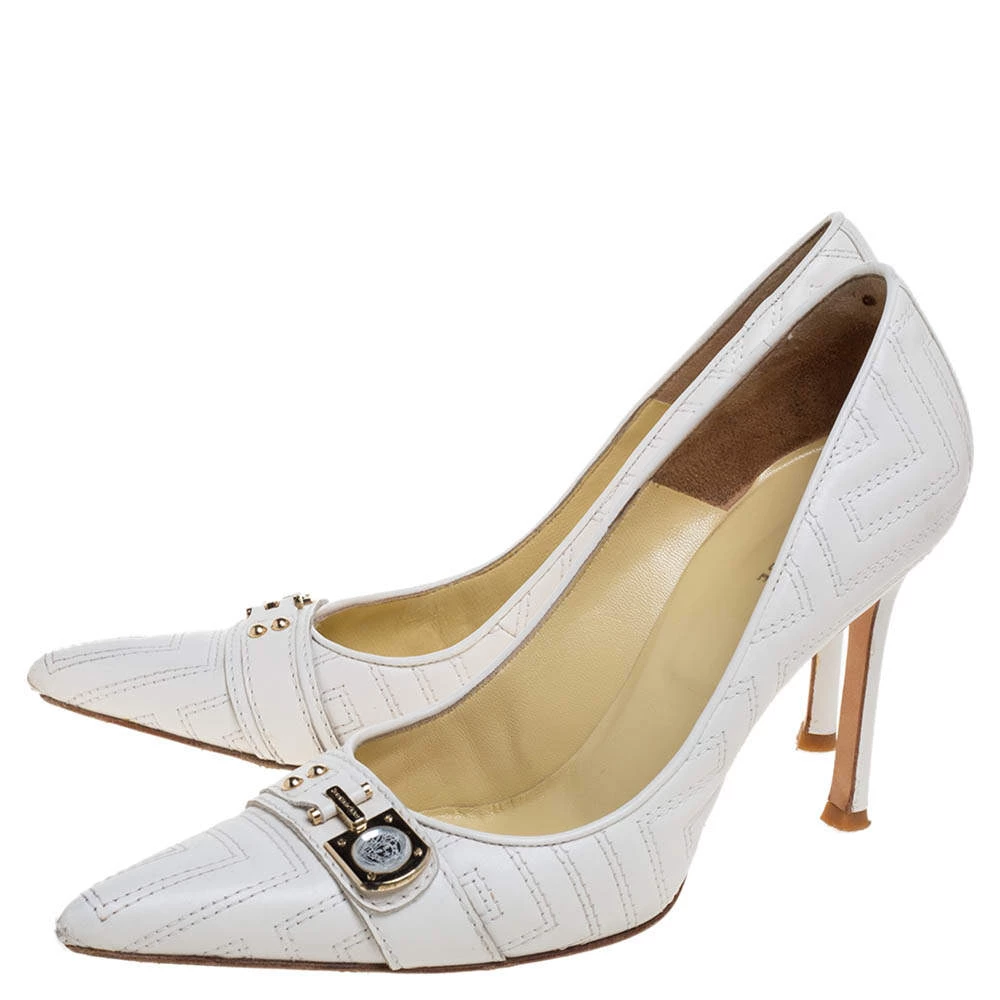 These white-colored Versace pumps are flowing with utmost splendor. They have been crafted from quilted leather material, styled with pointed toes and beautifully balanced on 10 CM heels. You will love owning this pair!