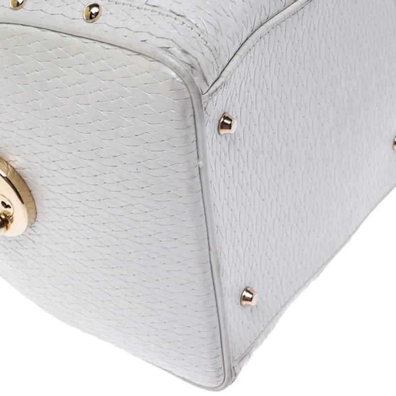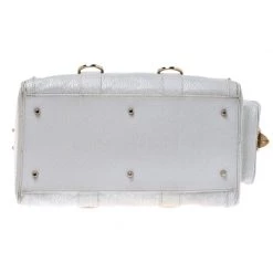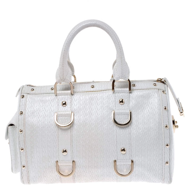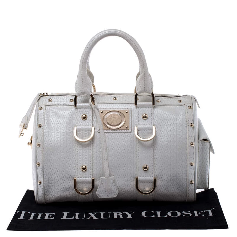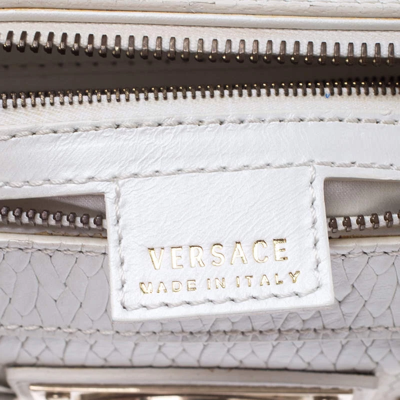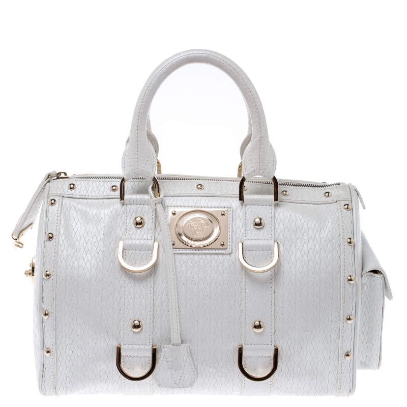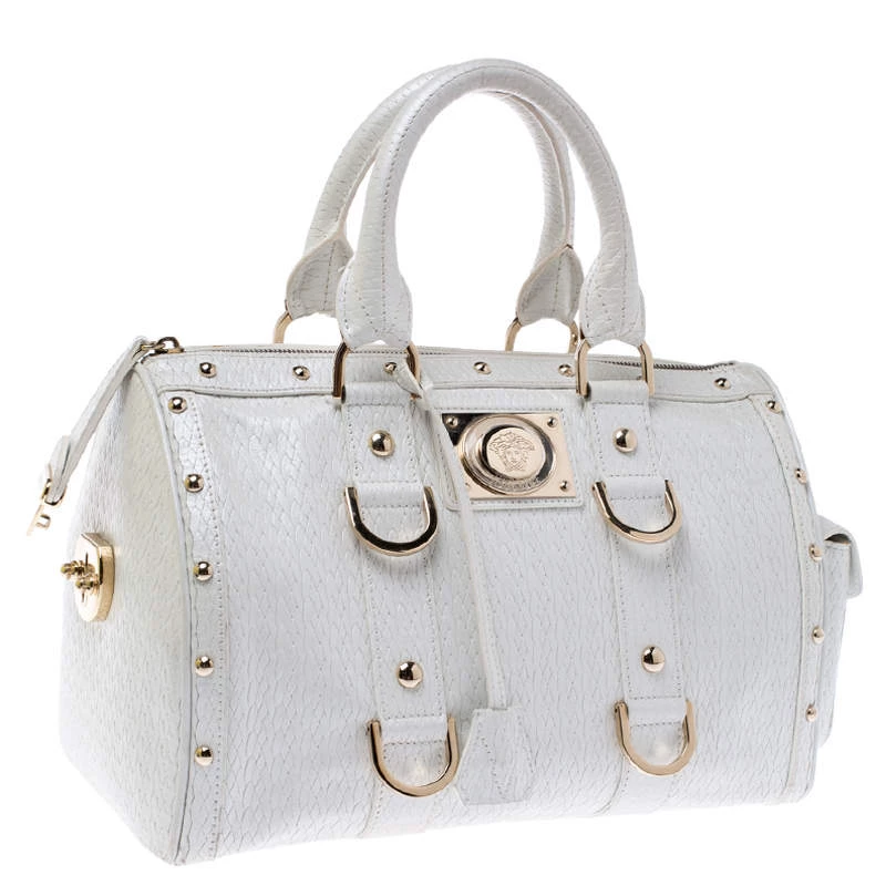 This white leather bag is the ideal pick for all your essentials. The satin lining of this bag is well-sized to house all your essentials. Made of superior quality, this studded Versace bag boasts of style and luxury.