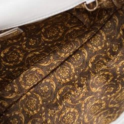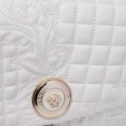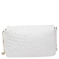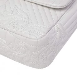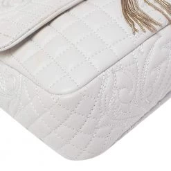 How gorgeous is this Vanitas Medea bag from Versace! Crafted from white leather, it carries a Barocco quilted design. The front flap flaunts the signature Medusa logo, a tassel charm and opens to a satin interior that can easily accommodate your daily essentials. The bag is held by the iconic Greek key chain-link and leather shoulder strap.