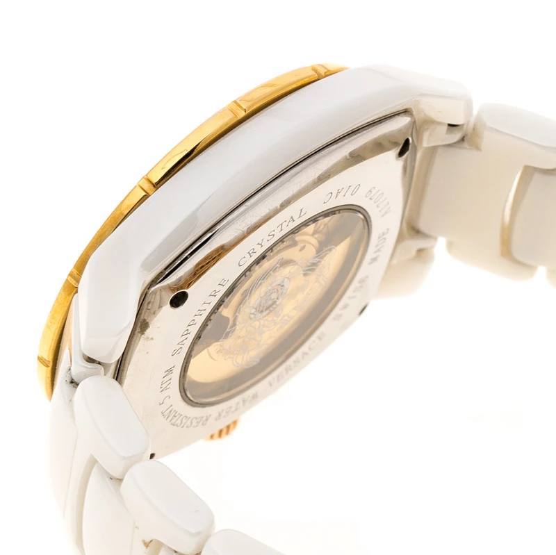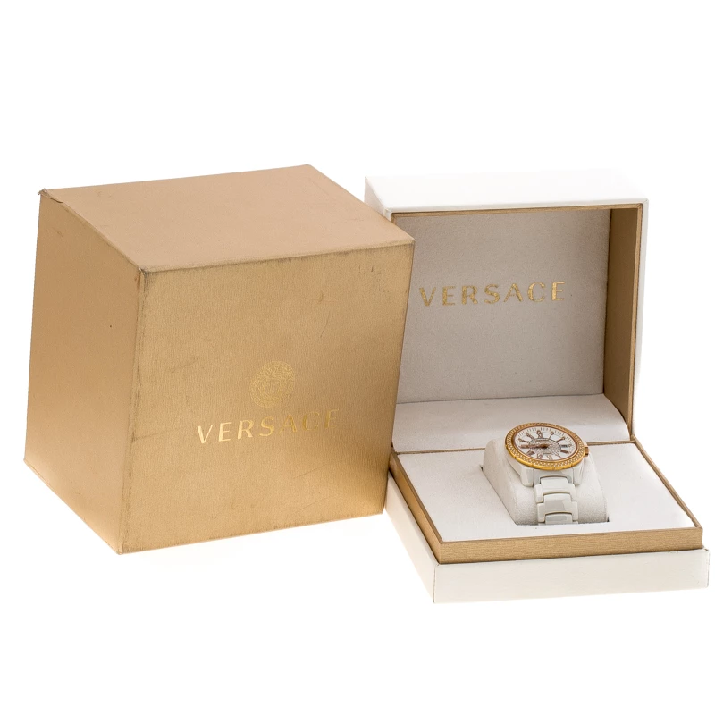 A vision of classic design, this unisex watch from Versace exudes quality and sophistication. The watch features round, gold-plated stainless steel case held by a white ceramic strap which comes fitted with gold-plated stainless steel deployment fastenings. Powered by automatic movement, this elegant timepiece has a gold crystal studded bezel and encased within is a white mother of pearl dial equipped with Arabic numerals and diamond hour markers and three hands. It also has a date window at three o’clock position. Complete with 50 metres of water resistance, this watch is a subtle way of giving yourself a polished look.