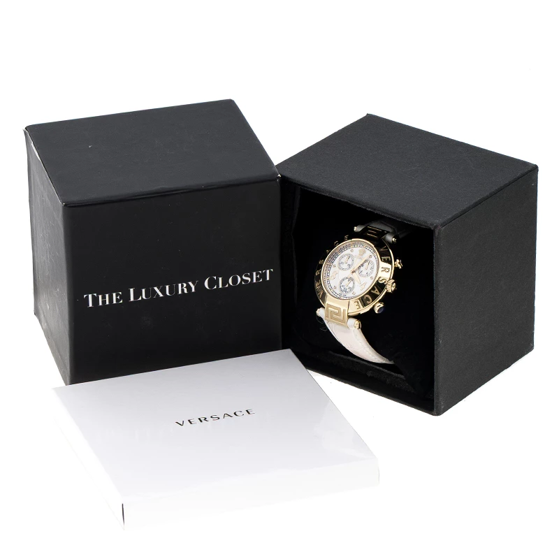 Pamper yourself with this gorgeous stainless steel Versace Aion watch featuring a quartz movement with chronograph and date complication. Gorgeous and stylish with an engraved bezel, the watch features a white mother of pearl dial and a white leather strap with deployant clasp that sits perfectly on your wrist.