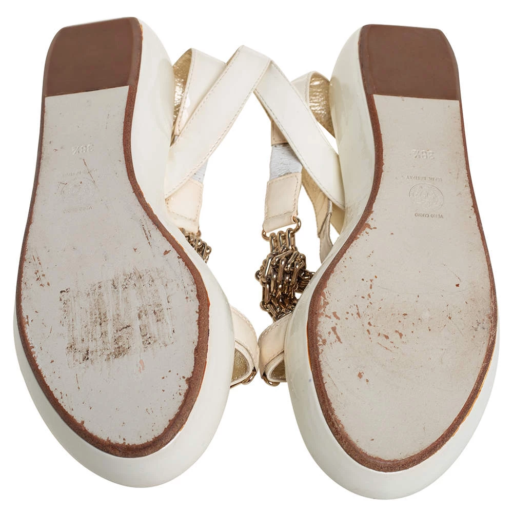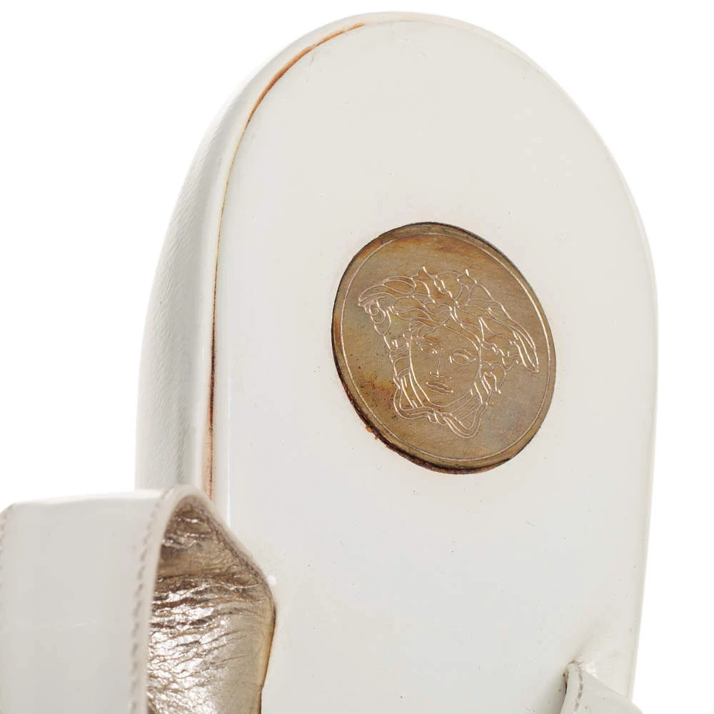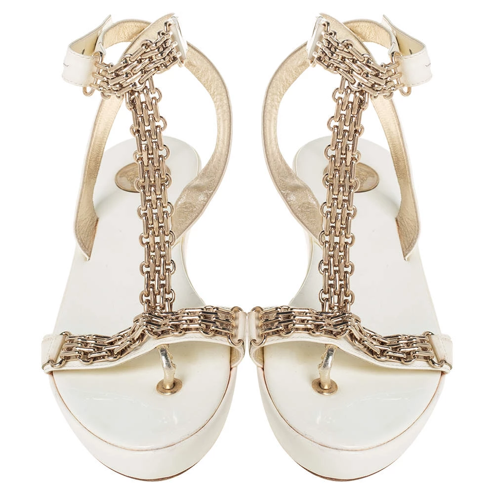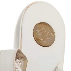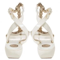 Versace’s timeless aesthetic and impeccable craftsmanship in shoemaking is evident in these stunning sandals. Crafted from patent leather in a white shade, they feature chain details for a chic appeal.