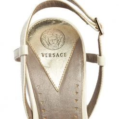Get the most comfortable walk with these Versace platform sandals. This pair comes in white patent leather and features open toes, slingback straps with buckles, as well as a quilted pattern on the wedge heels.