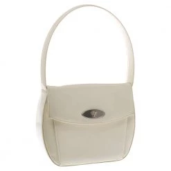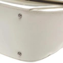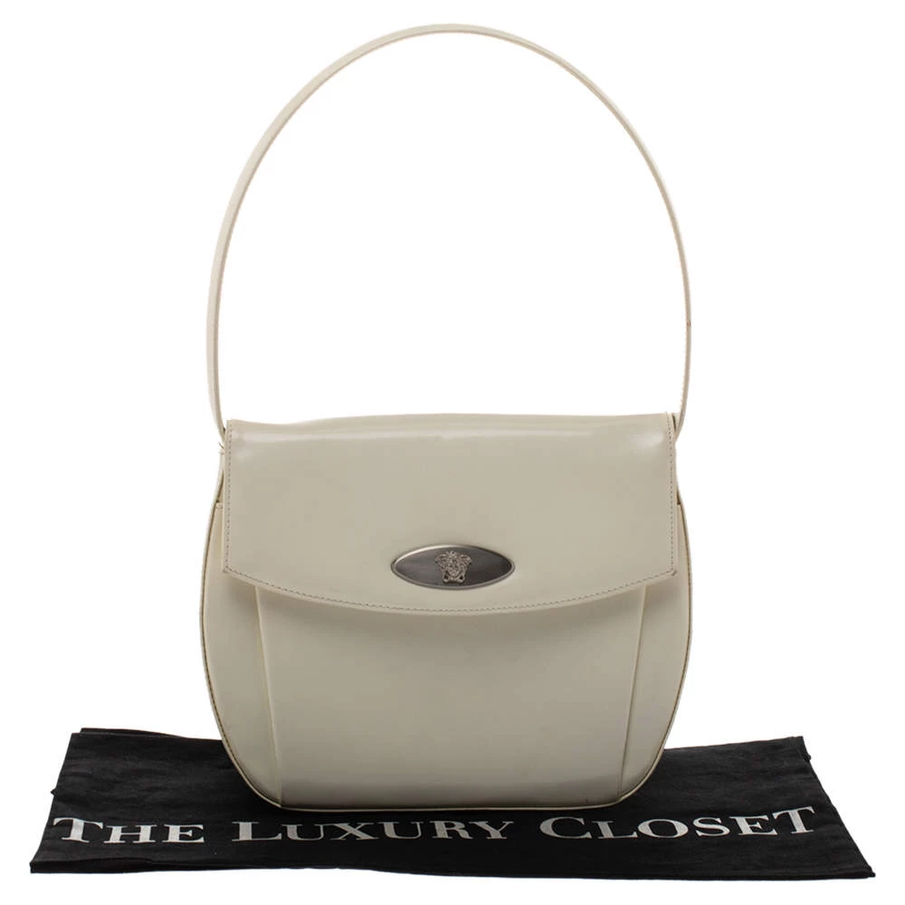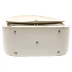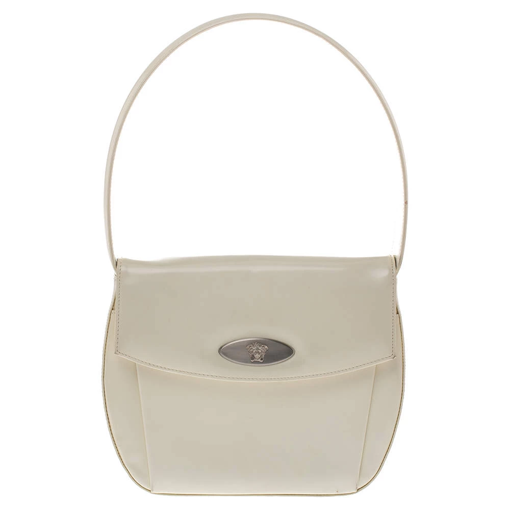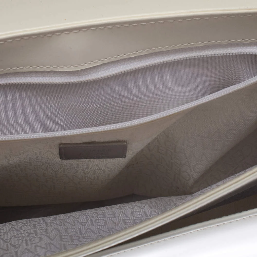 This stylish and glossy shoulder bag by Versace will make sure you are the talk of the town. Its versatile exterior comes in a lovely shade of white and is crafted from quality patent leather. It is styled iwth a front flap that carries the brand logo and opens to a spacious nylon-lined interior. It is equipped with a zip pocket and a single handle. It is further beautified with silver-tone hardware.