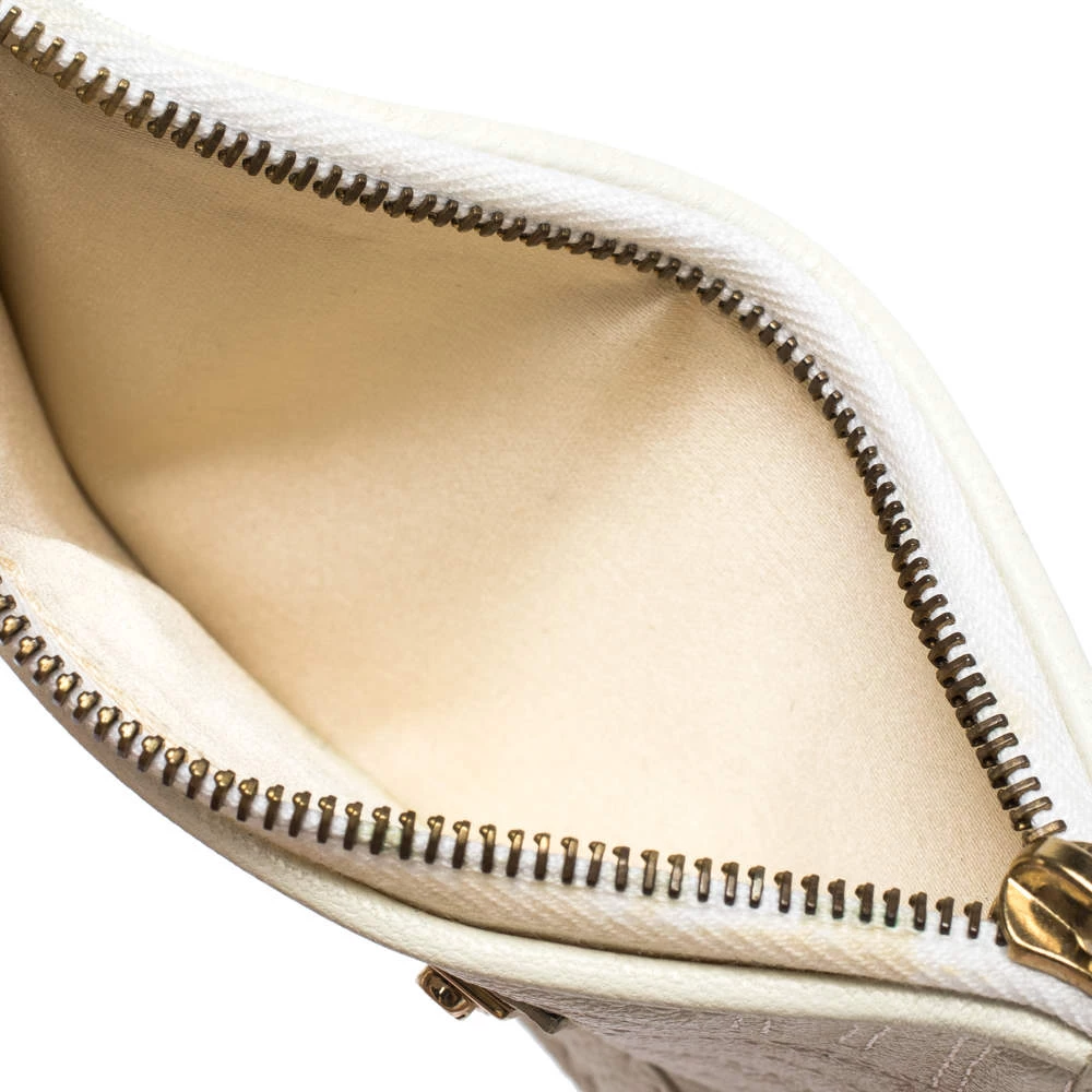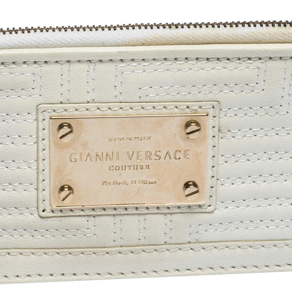 This coin purse is a lovely creation from the house of Versace. Crafted from leather, it is decorated with the brand logo on the front and metal edges. It comes with a zip-secured interior and equipped with a gold-tone chain-link key charm. Amp up your style game with this white, quilted creation.