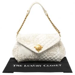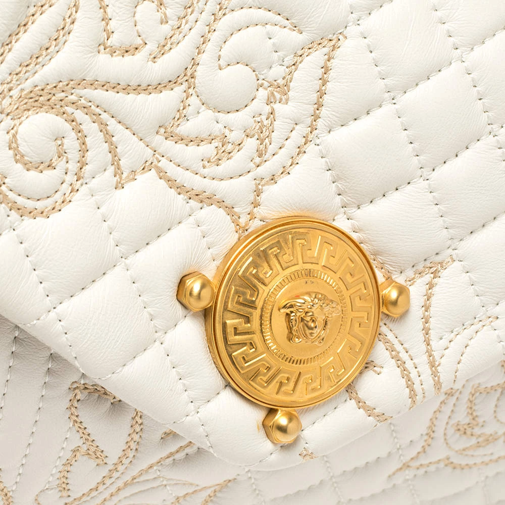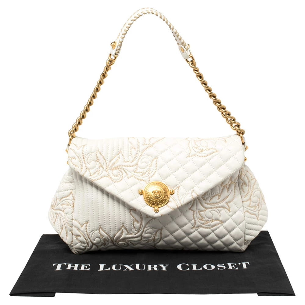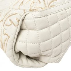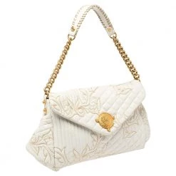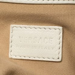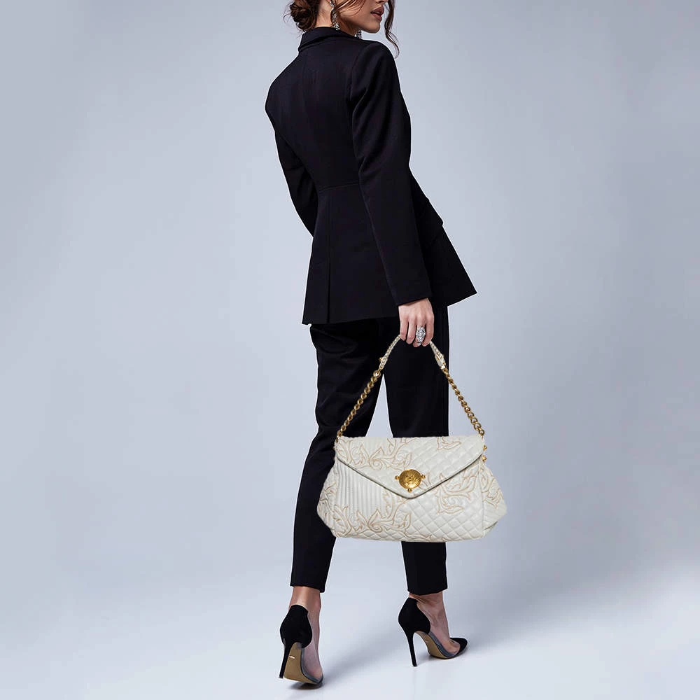 This Versace Barocco bag delights not only with its appeal but craftsmanship as well. It is held by a single handle, adorned with lovely embroidery all over, and equipped with a spacious canvas interior. The unique shape, the notable Medusa logo in gold-tone, and the impeccable style effortlessly add to the marvel of this coveted piece.