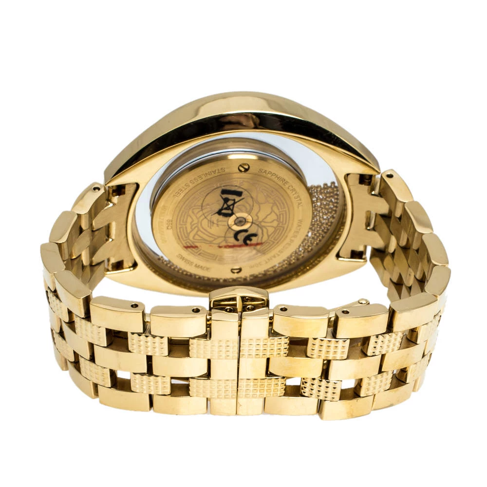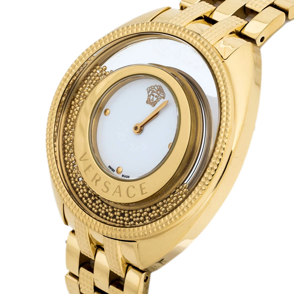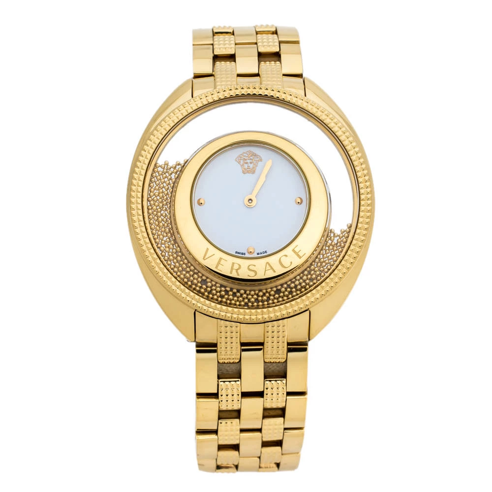 This beautiful timepiece from the house of Versace is sure to be a conversation starter with its eclectic and eye-catching design. Constructed in gold-plated stainless steel, this Destiny Spirit 86Q watch features a transparent panel on the case which is filled with gold-plated micro spheres floating as you move.