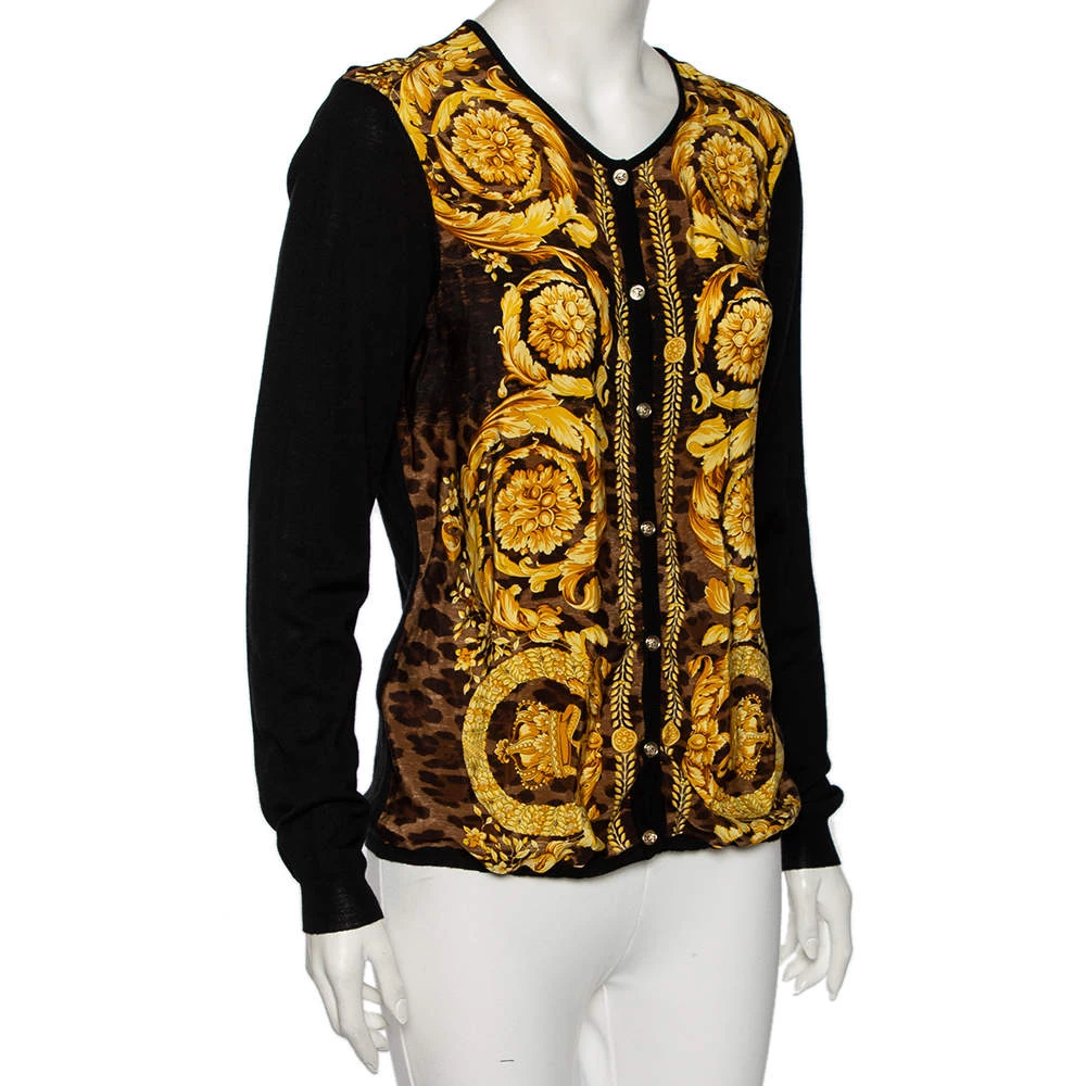 This cardigan from the House of Versace is beautifully made and will elevate your style for the winter. It is tailored using black wool knit and Baroque printed silk. It has paneled detailing, long sleeves, and a button-front feature.