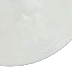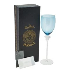 This Versace x Rosenthal water goblet is made of glass. It has a blue-tone bow and a slim, long stem that has the Medusa motif for an unmissable brand mark. It is a fine gifting option.