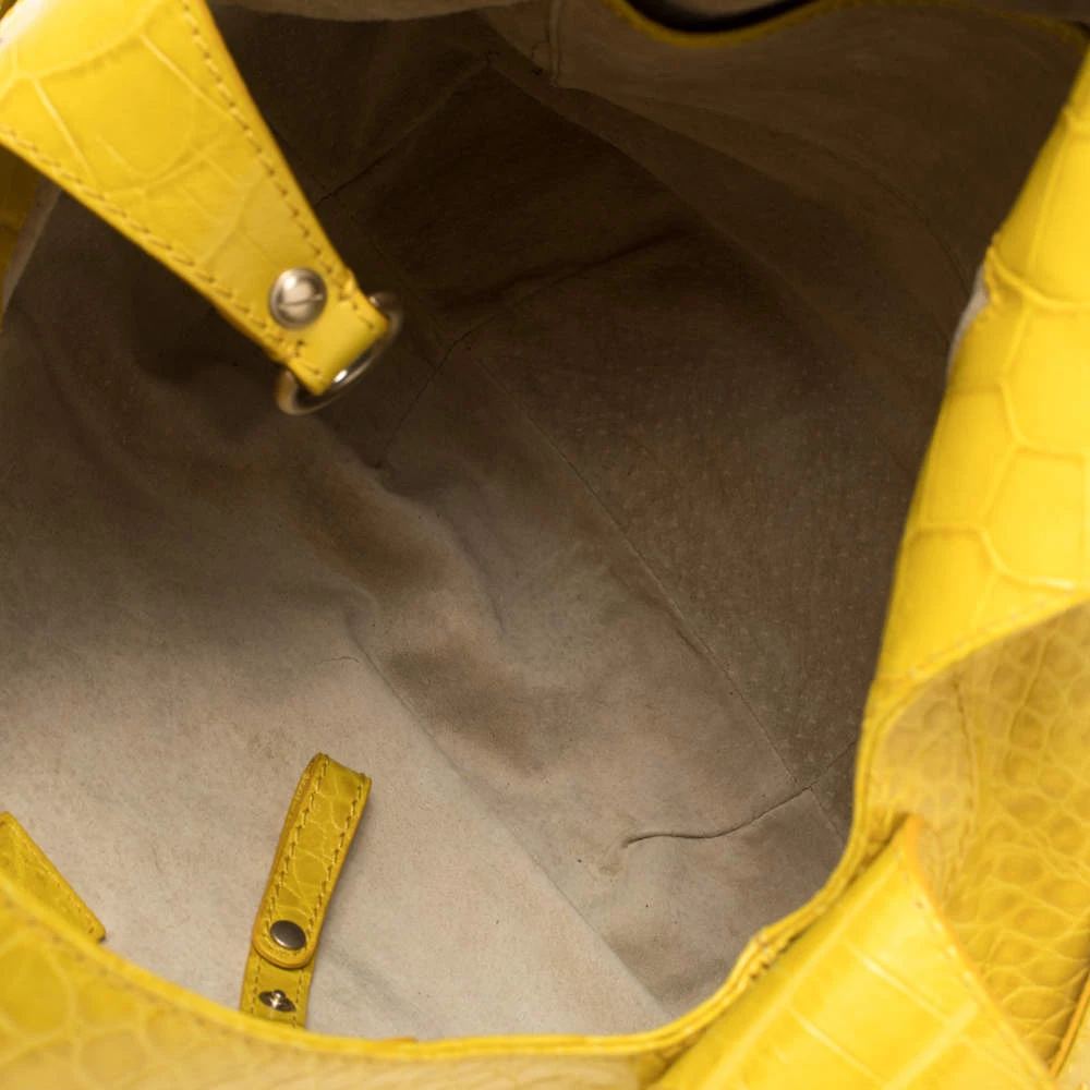 High in appeal, this Kiss shoulder bag from Versace has been created to add to your incredible sense of style. Crafted from yellow croc-embossed leather, the piece comes equipped with a suede interior for storing your essentials. The bag is complete with dual woven handles, a shoulder strap, and a gold-tone logo plaque detailing on the front.