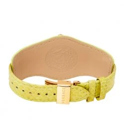 This Versace wristwatch will surely be a fresh addition to your casual style. The watch is made from rose gold-plated stainless steel and set on yellow-green leather. It has signature engravings on the bezel and elegant markers on the dial. The quartz watch can be fastened with the butterfly clasp.