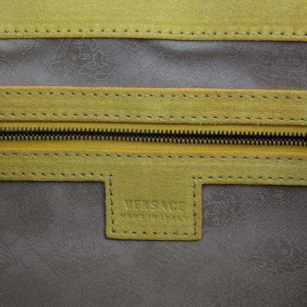 Be a show stopper with this bright designer bag from Versace. This yellow bag is adorned with patent leather exterior that features a flap opening, twist lock fastening and a small leather handle. The canvas lined interior comes with a zipper pocket and a patch pocket.Original Retail Price: $1,895