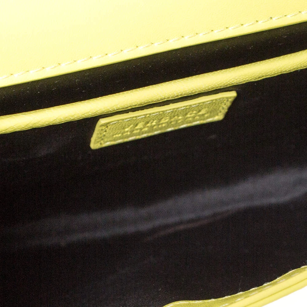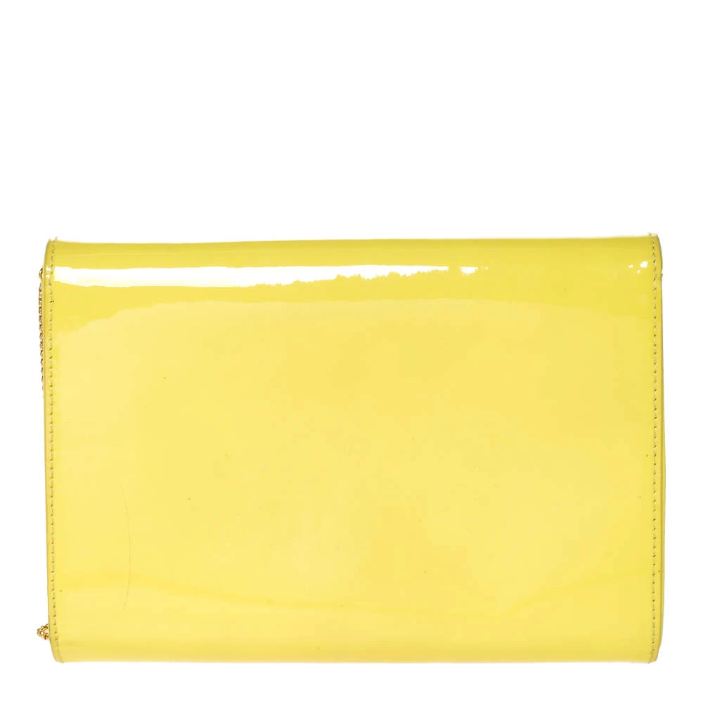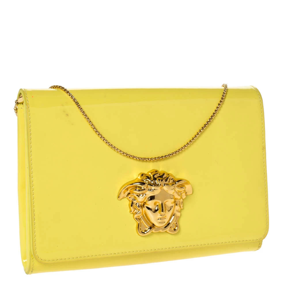 This clutch from Versace is designed in a yellow patent leather body. It brings a Medusa-adorned flap to secure the interior which is lined with satin. It comes held by a long chain and is perfect for evenings.