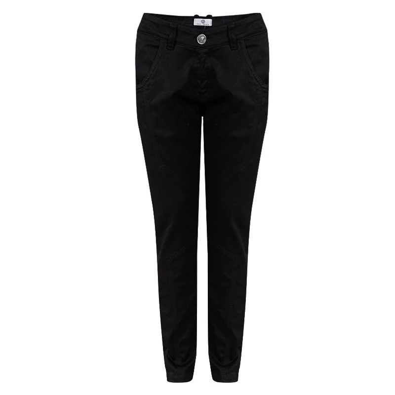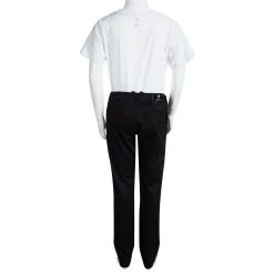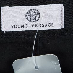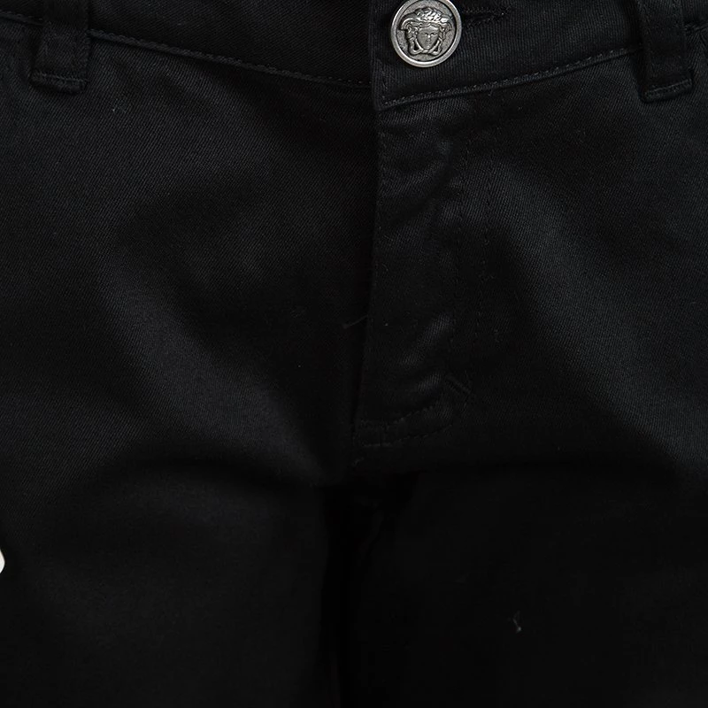 Young Versace creates cutting-edge designs for the budding fashionistas. These black cotton denim jeans are crafted for a mid-rise, has two front pockets, and is punctuated with logo engraved silver-tone metal hardware patch at the back of the waist.