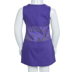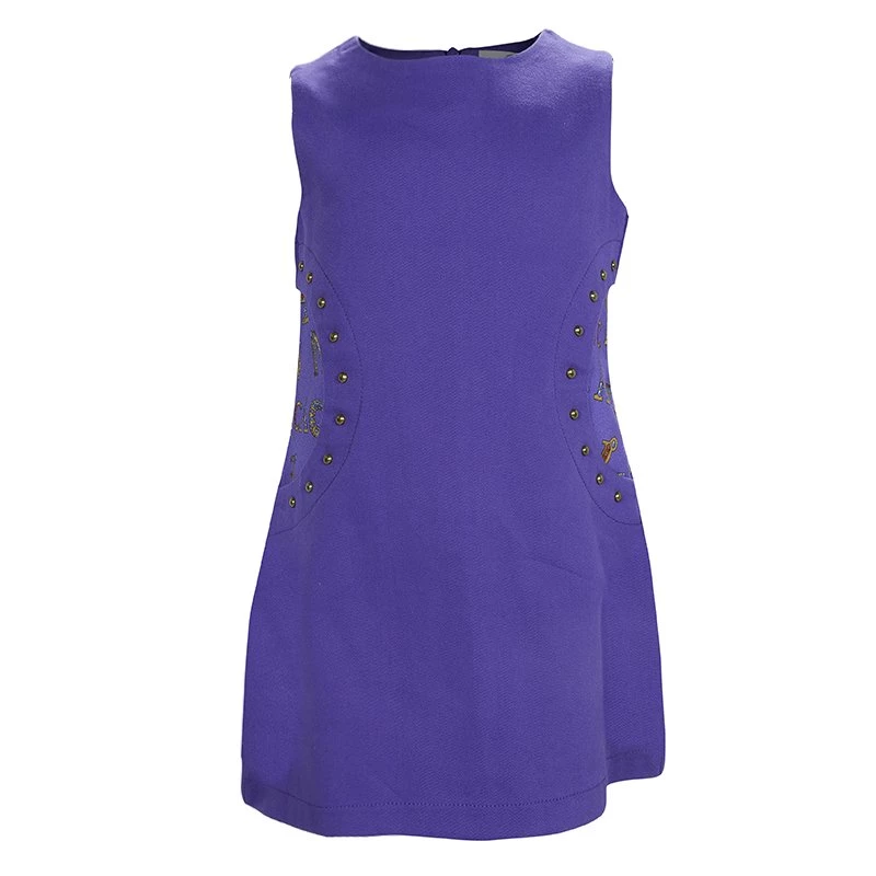 This dress embodies the cutting-edge design that Versace is well-known for. This regal dress has a flawless princess cut with a simple round neck. This adorable piece is sleeveless and it is elevated by golden signature Versace branding along the sides.