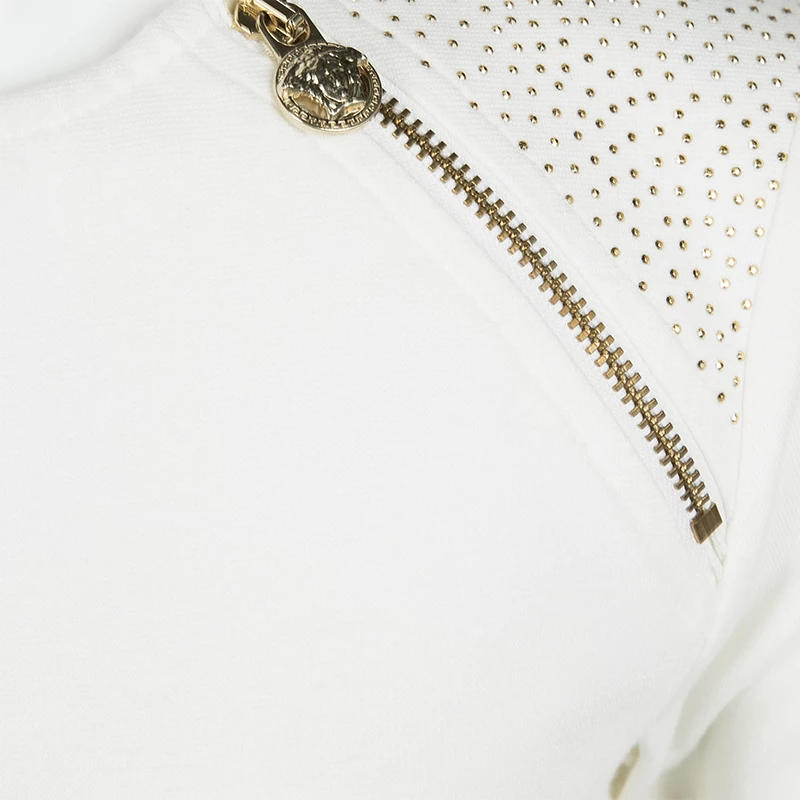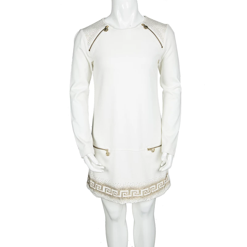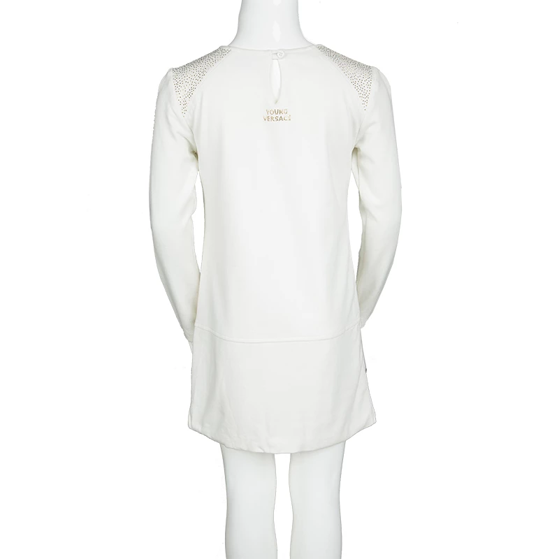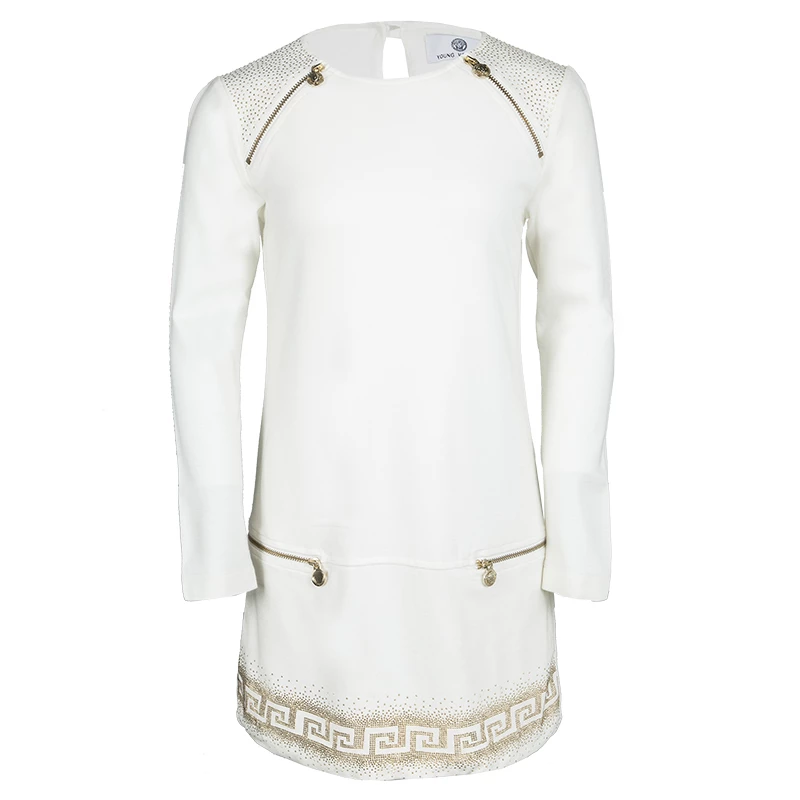 This white dress by Young Versace will be perfect for your little girl’s wardrobe. It has been made from the finest materials and styled with long sleeves and the famous Medusa logo as the zipper pulls. Stud details and zippers make the gorgeous dress complete.